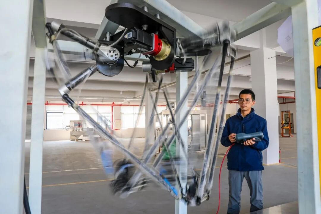 中科智能工作人员正在测试“蜘蛛手”并联机器人。王振宇 摄